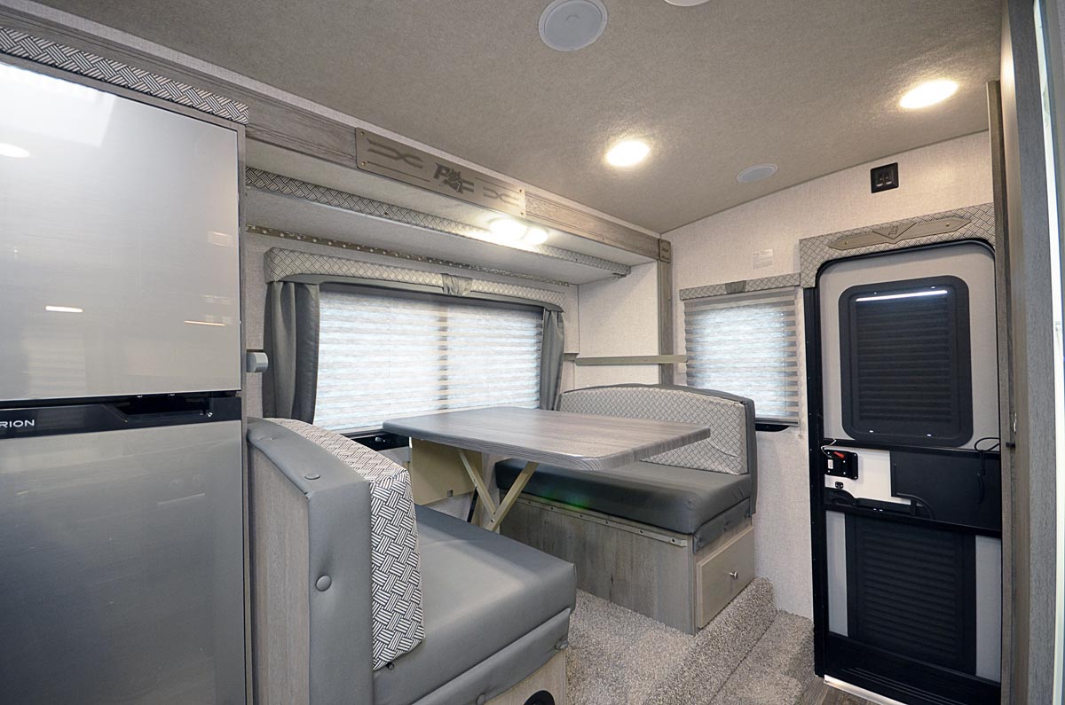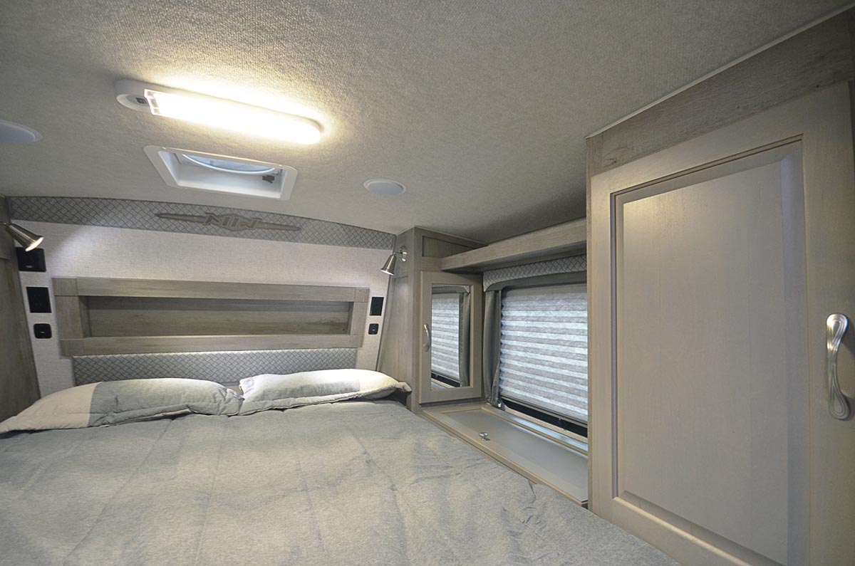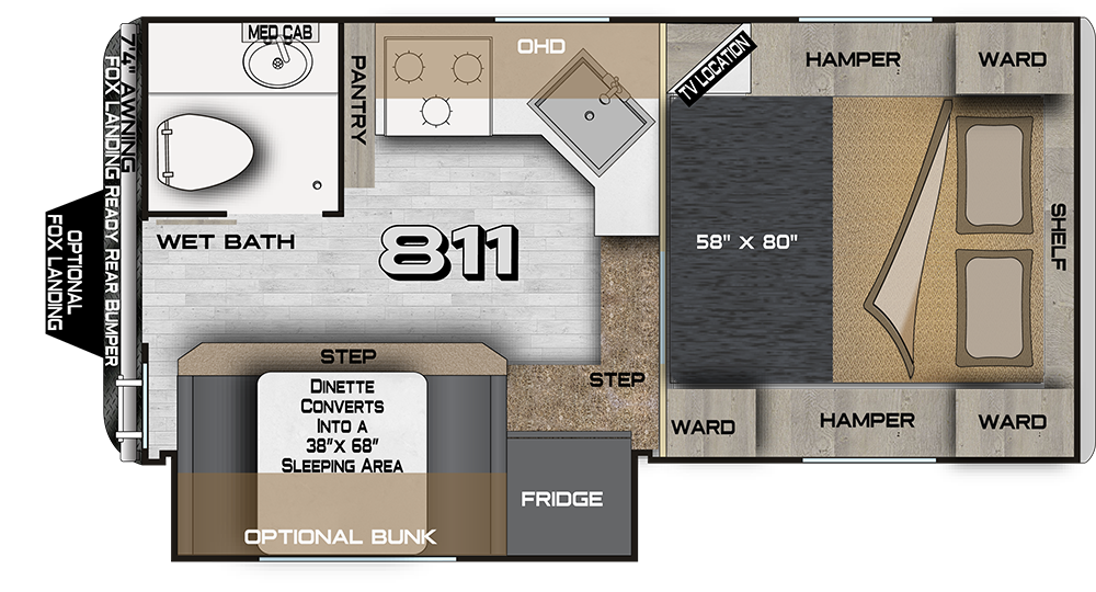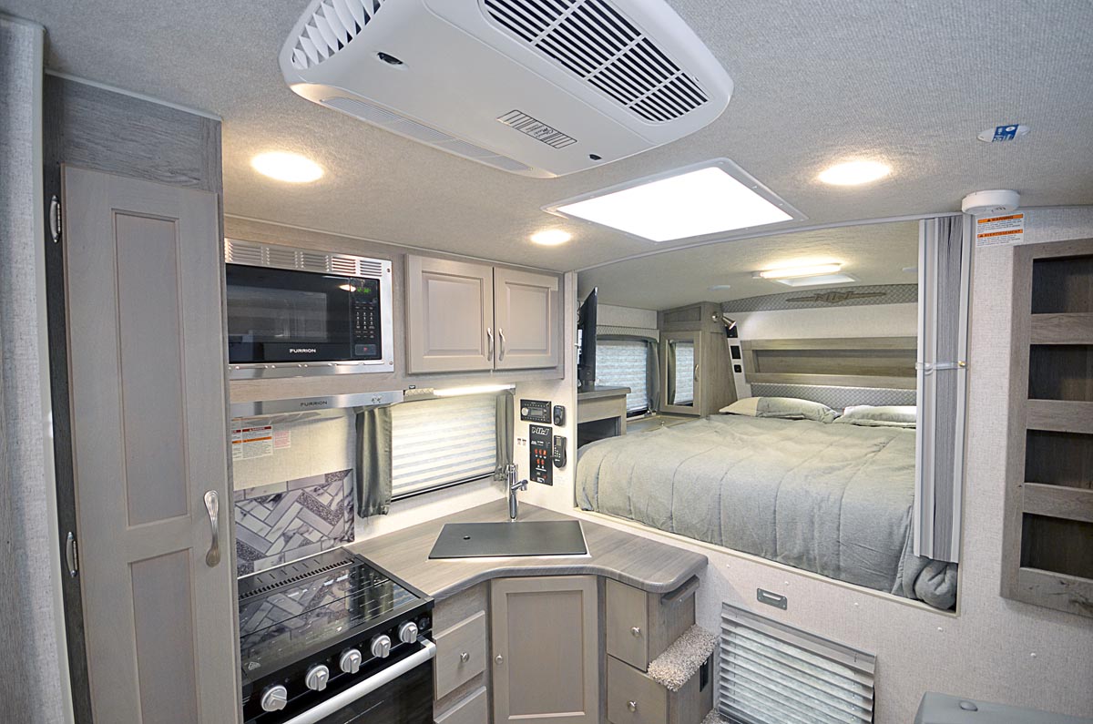A compact hard-side camper for short-bed trucks. Full bathroom, kitchen, and cabover sleeping area in a well-insulated four-season package.