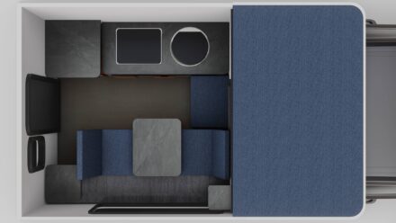 The kitchen is basic but functional — a two-burner propane stove and small countertop. No built-in fridge (most owners add a portable 12V cooler). The layout works well for simple meals. Some owners add a pull-out kitchen modification for outdoor cooking.