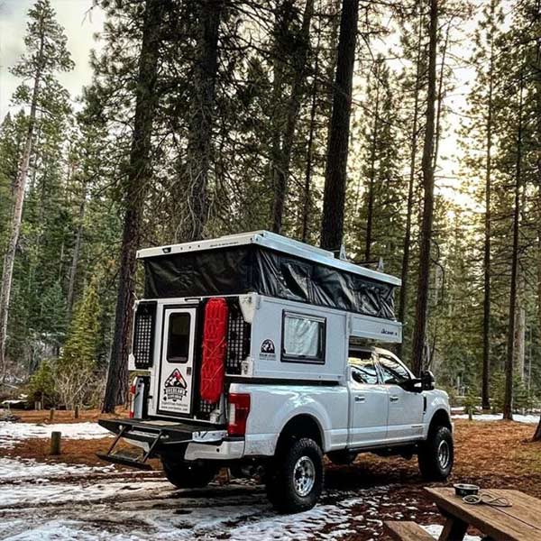 Canadian-built expedition camper designed for flatbed trucks. Full composite construction with integrated living quarters, designed for extended off-grid travel in remote locations. Features walk-in interior with standing headroom.
